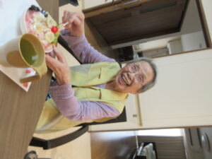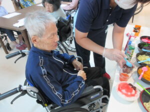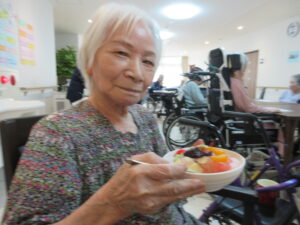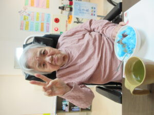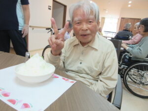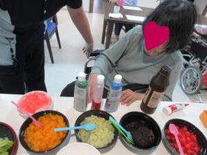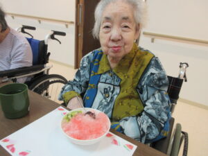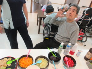 皆様、「どれにしようか迷う~(>_<)」、「いっぱいフルーツのせて~😊」、「あなたのかき氷、きれいな色やねぇ✨」など、利用者様同士交流される様子もみられ楽しんでいただきました✨