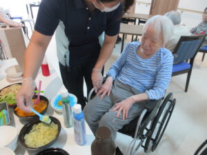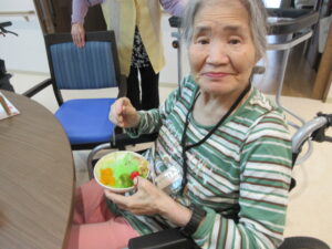 普段、水分にとろみをつけている人にはとろみ付きのかき氷を提供し、トッピングにはゼリーをのせました!(^^)!