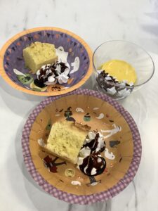 さつま芋をふんだんにつかった、しっとり濃厚なケーキ🍰に生クリームとチョコソースを添えて…