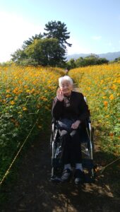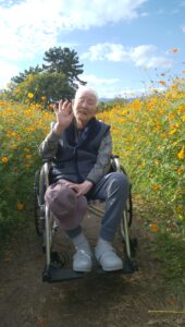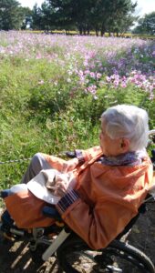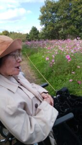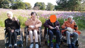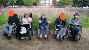 武庫川コスモス園に外出しました🌼 天候にも恵まれ満開のコスモスをご覧になり、多くの笑顔を拝見することができました 季節外れの桜も咲いており、良い外出ができてよかったです😊